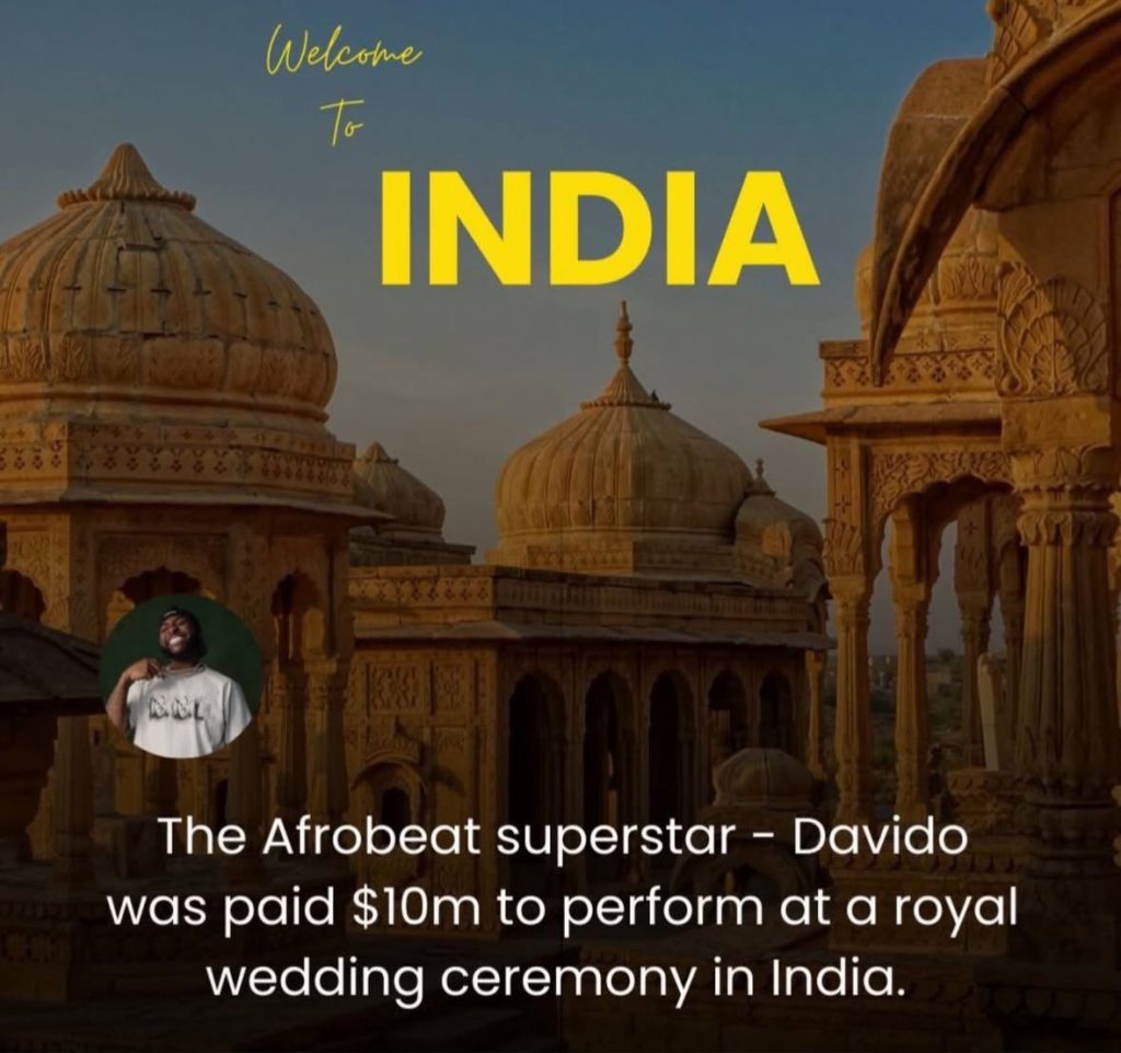 Davido is Reportedly paid $10 Million (16 Billion Naira) to perform at a Royal Wedding Ceremony in India Tonight