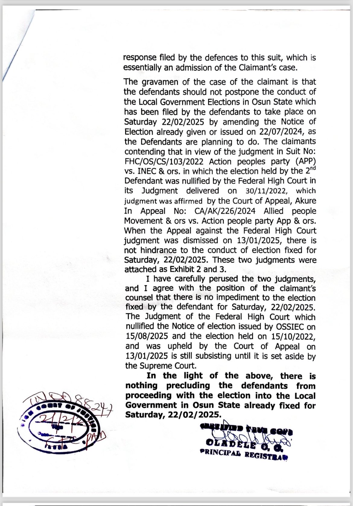 An Osun State High Court sitting in Osogbo has ordered the State Independent Electoral Commission, OSIEC, to conduct the local government election scheduled for Saturday, February 22, 20225.