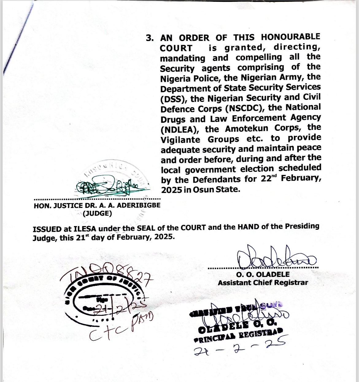 The court further directed and compelled all the security agencies, comprising the Nigeria Police, the Nigeria Army, the Department of State Security Services (DSS), the Nigeria Security and Civil Defense Corps (NSCDC), the National Drug Law Enforcement Agency (NDLEA), the Amotekun Corps, the Vigilante group etc in the state to provide adequate security during and after the election.