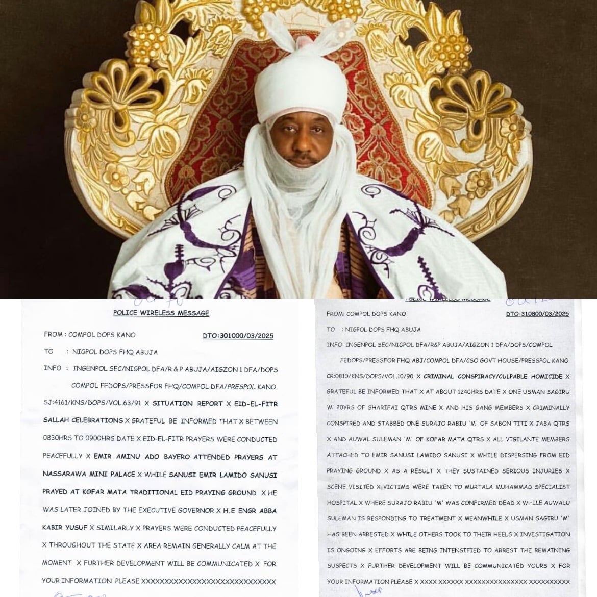 A recent police reports on a wireless signal dated March 30, 2025, has cast serious doubt on subsequent claims of violence during the Eid-el-Fitr celebrations in Kano. The document contradicts allegations that led to the controversial police invitation of the Emir of Kano, Muhammadu Sanusi II, for questioning.